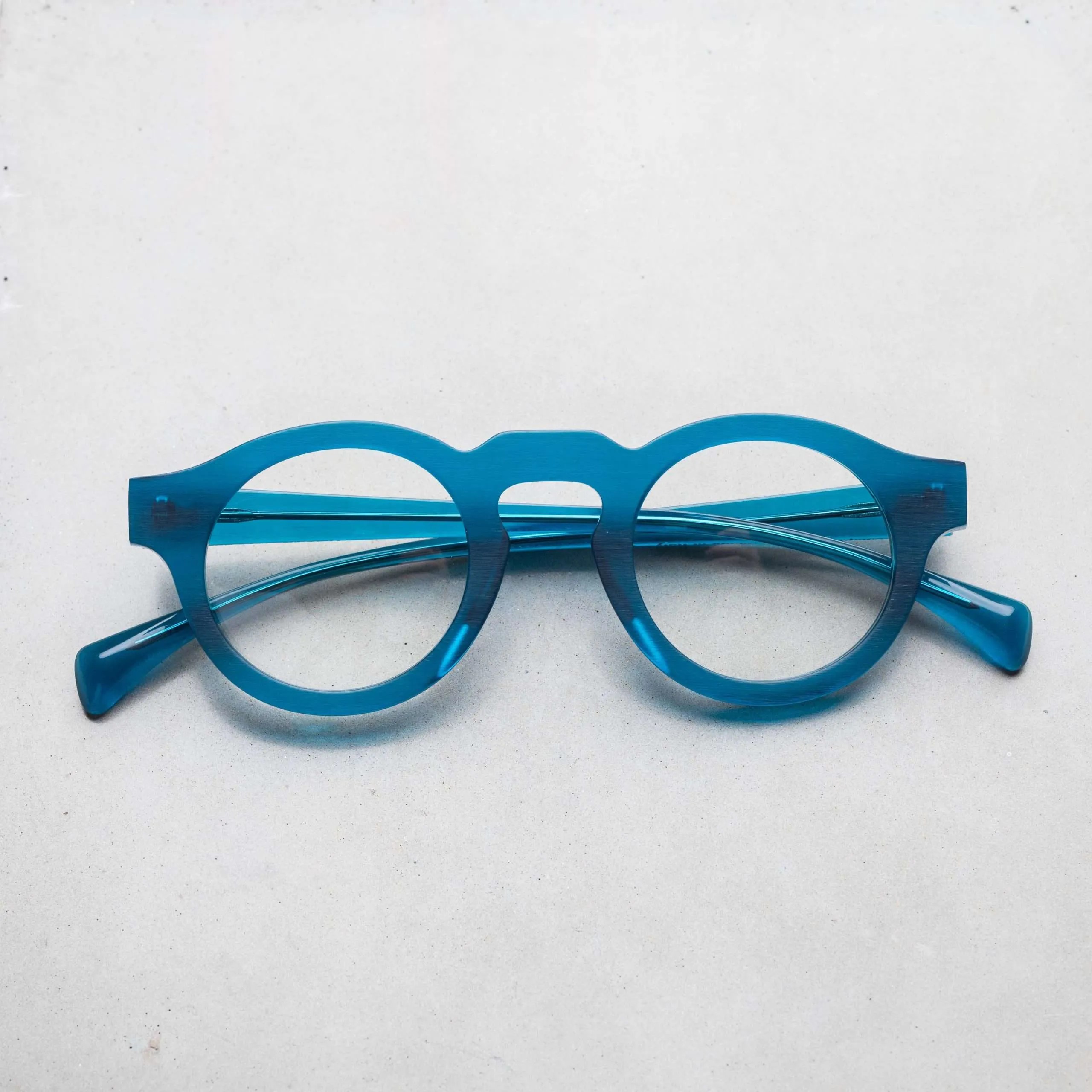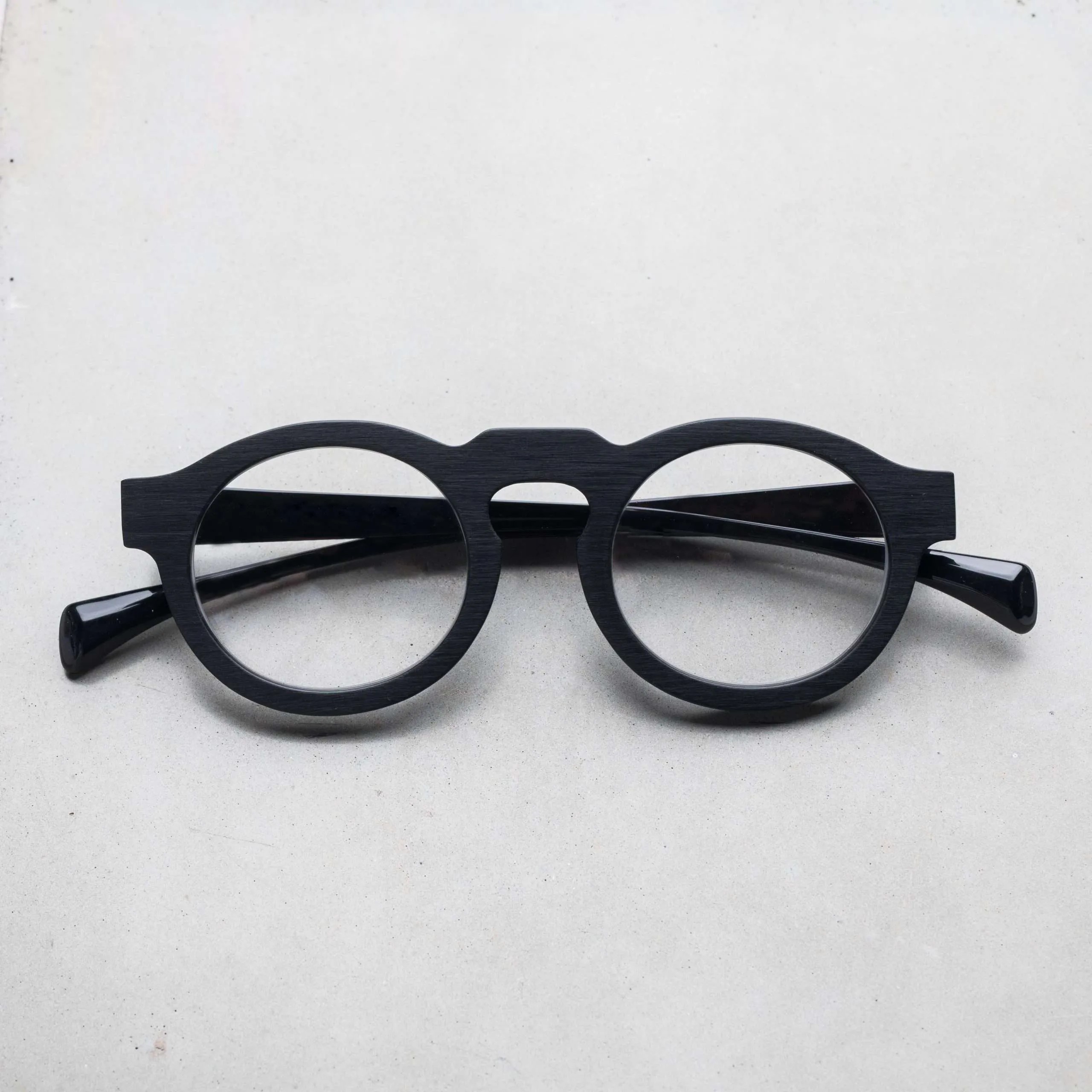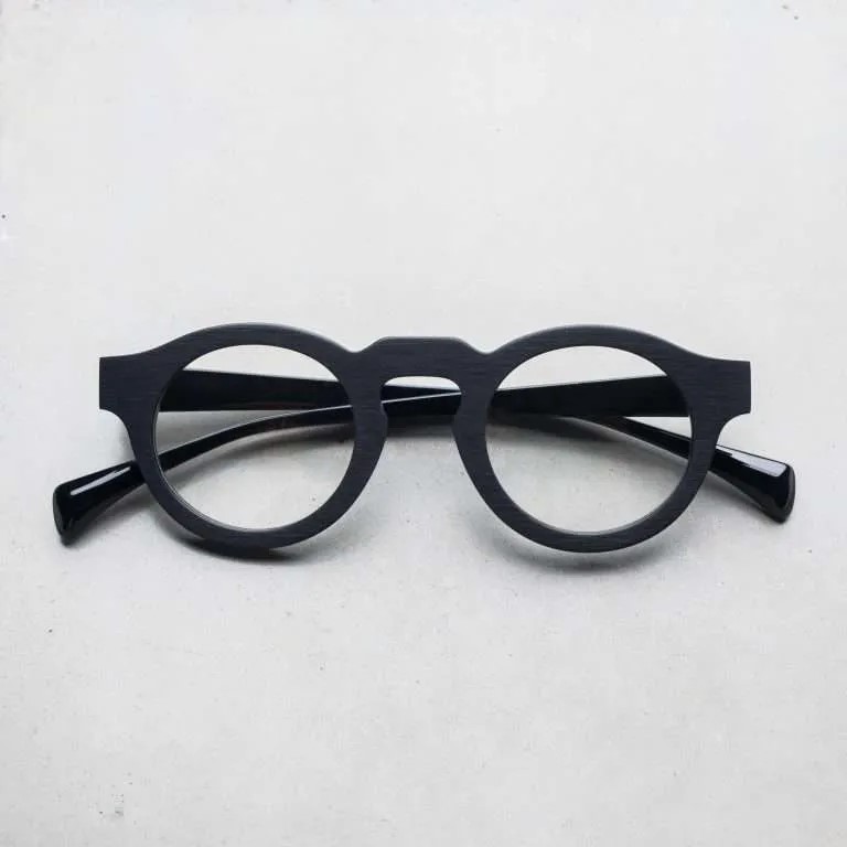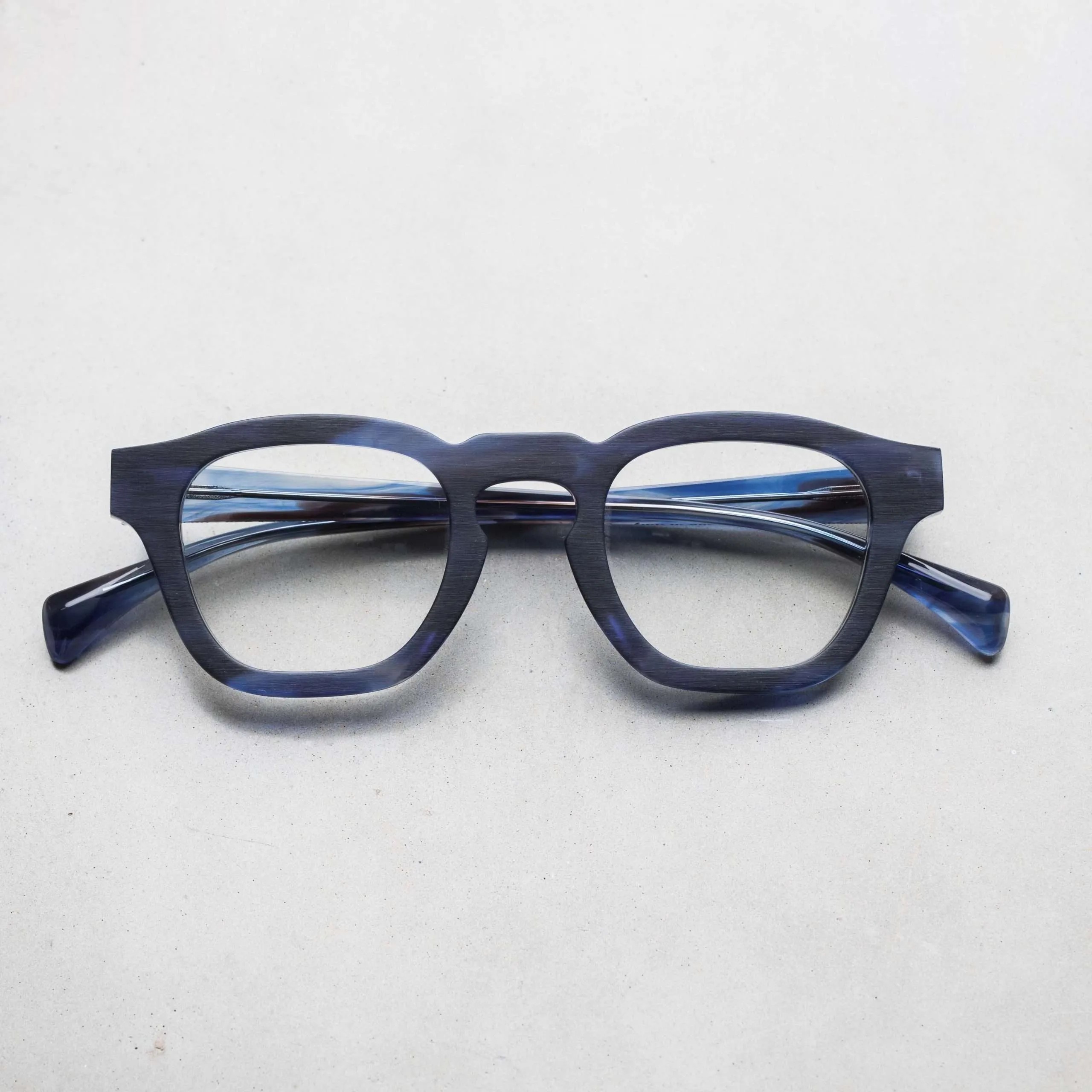 ブラッシングにより艶を消した表面加工やフラットなフロントデザイン、テンプル下の見えない部分にブランド名やモデル名を刻印するなど、ウィットに富んだセンスが随所から伺えます。