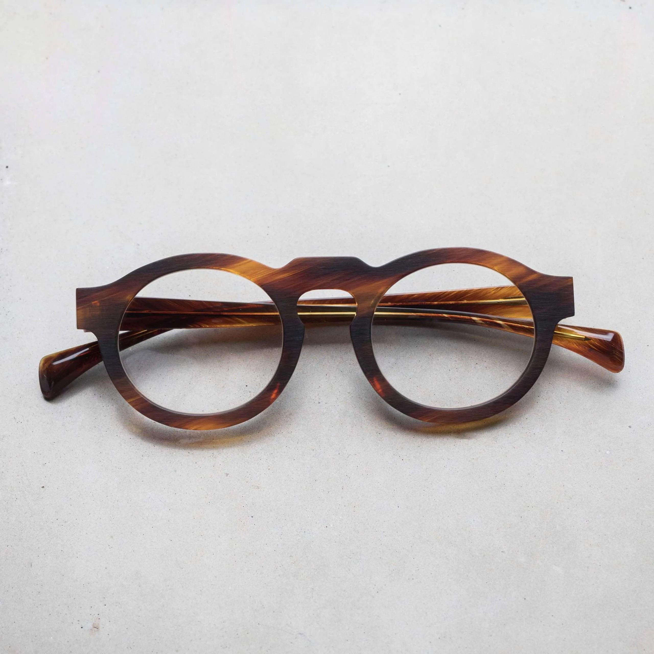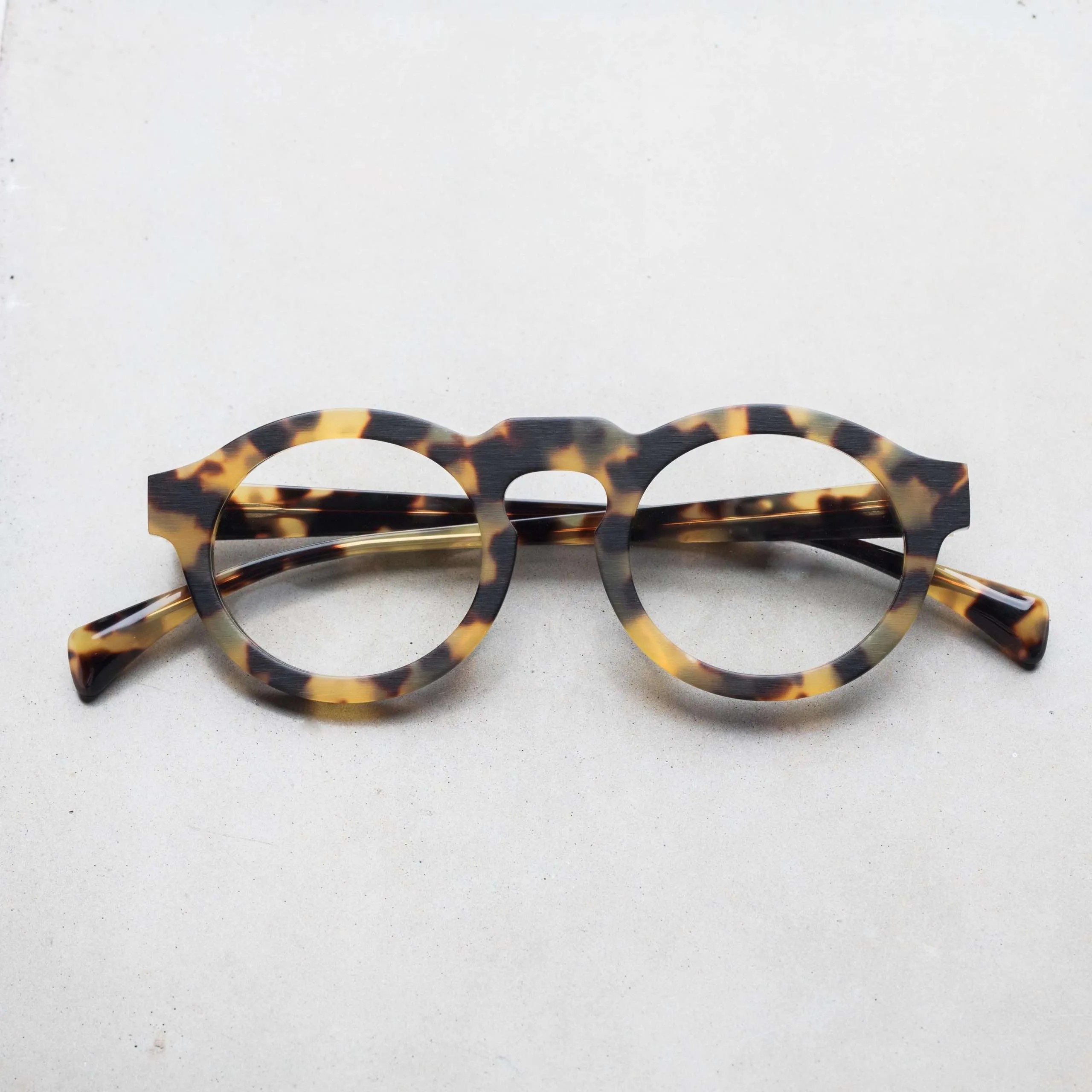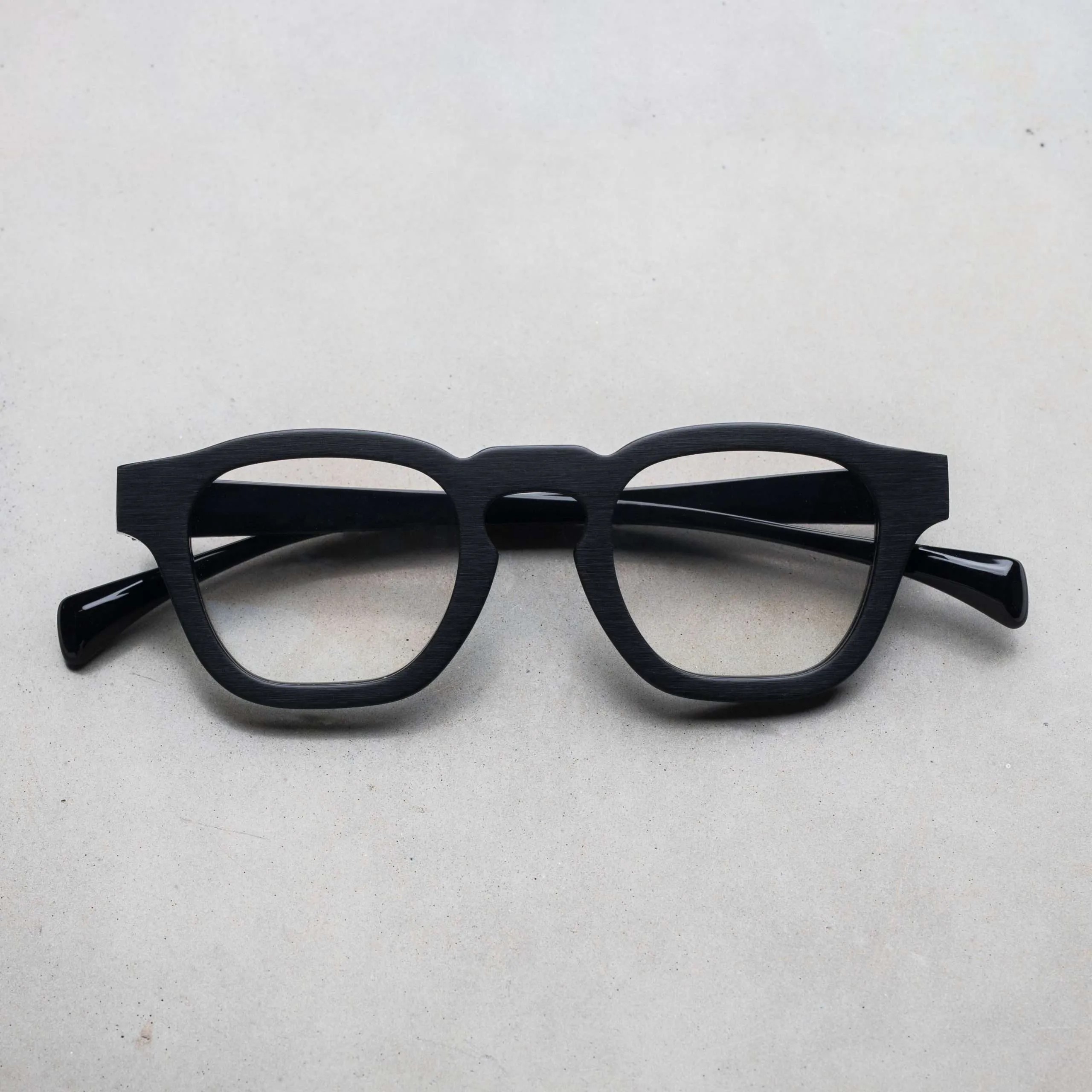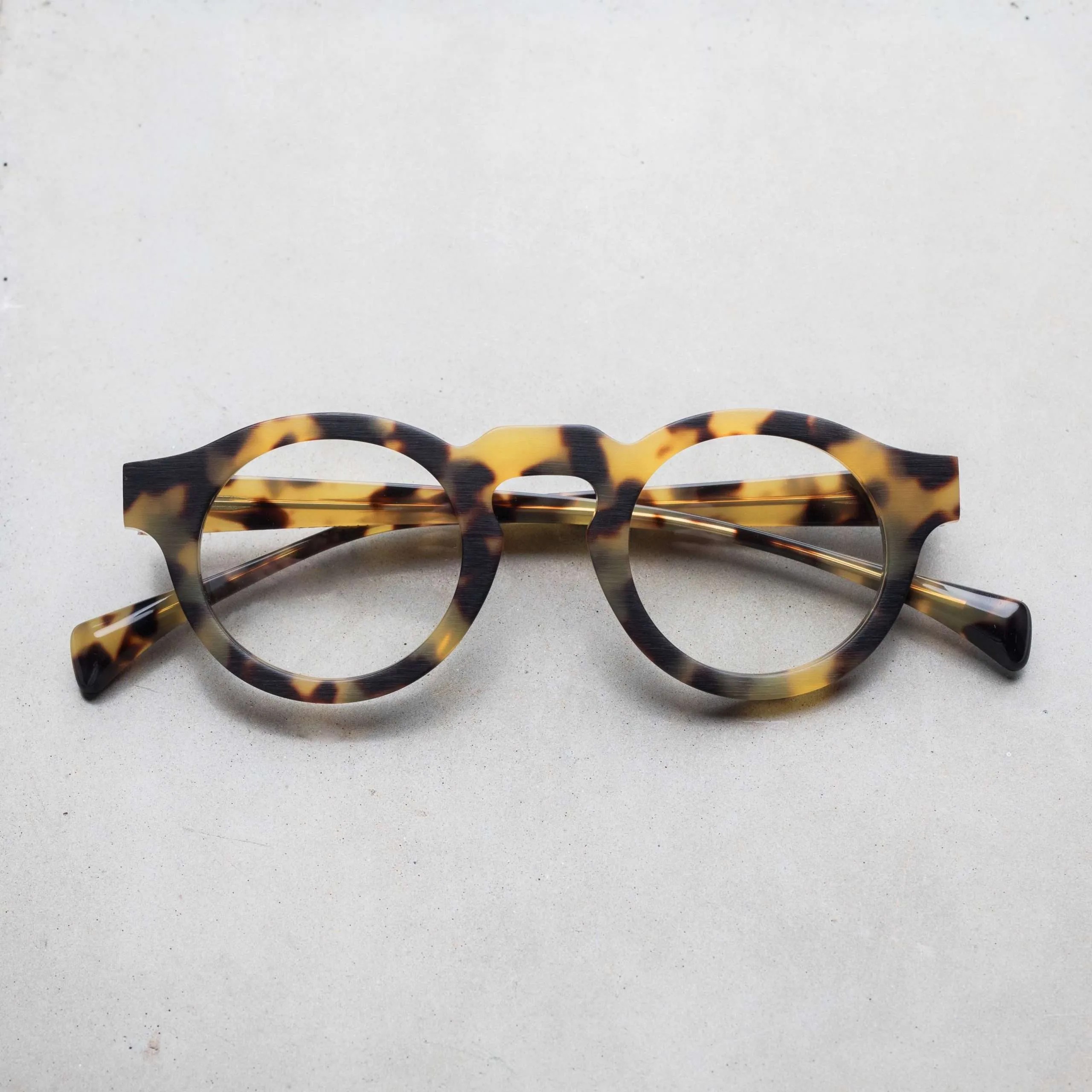 ブラッシングにより艶を消した表面加工やフラットなフロントデザイン、テンプル下の見えない部分にブランド名やモデル名を刻印するなど、ウィットに富んだセンスが随所から伺えます。