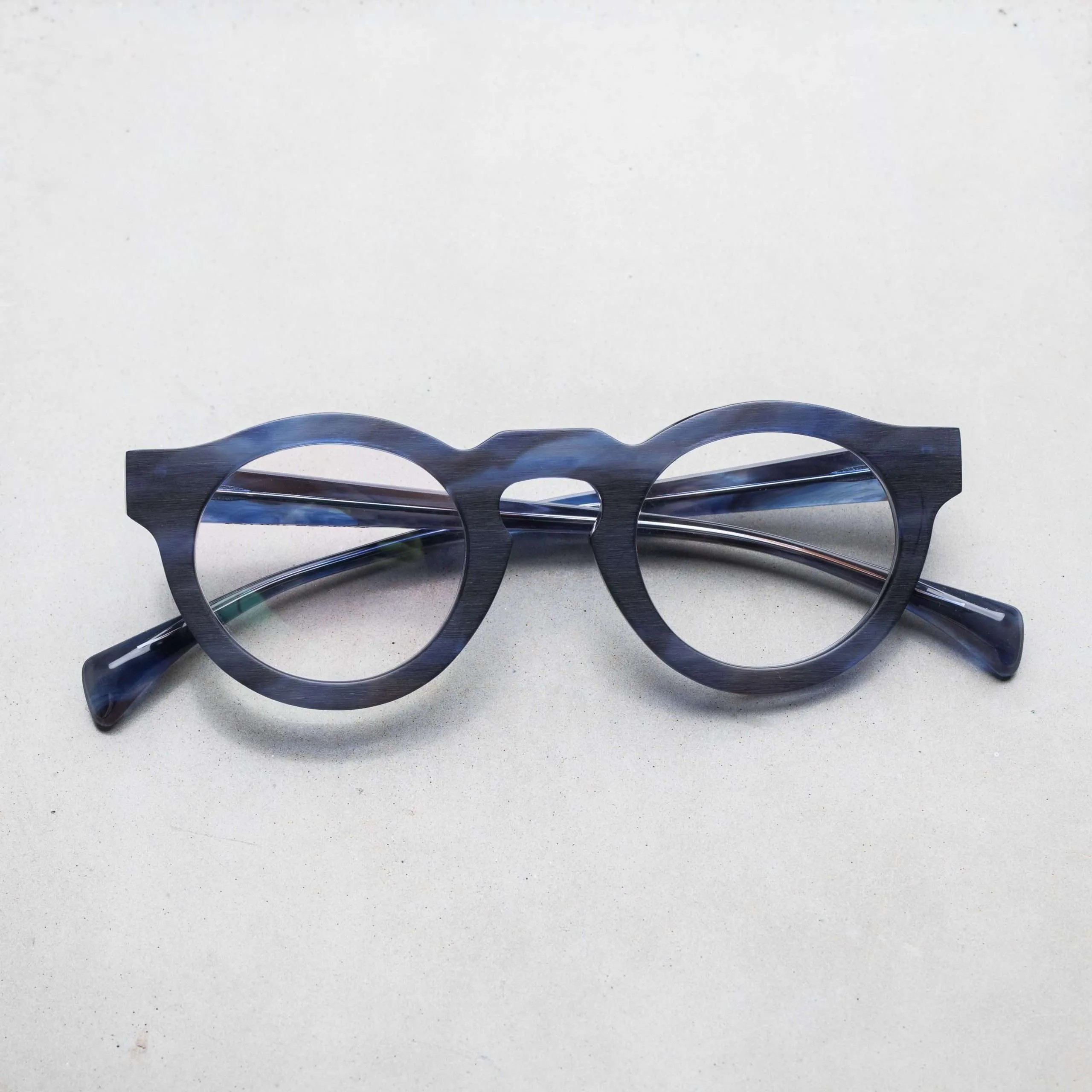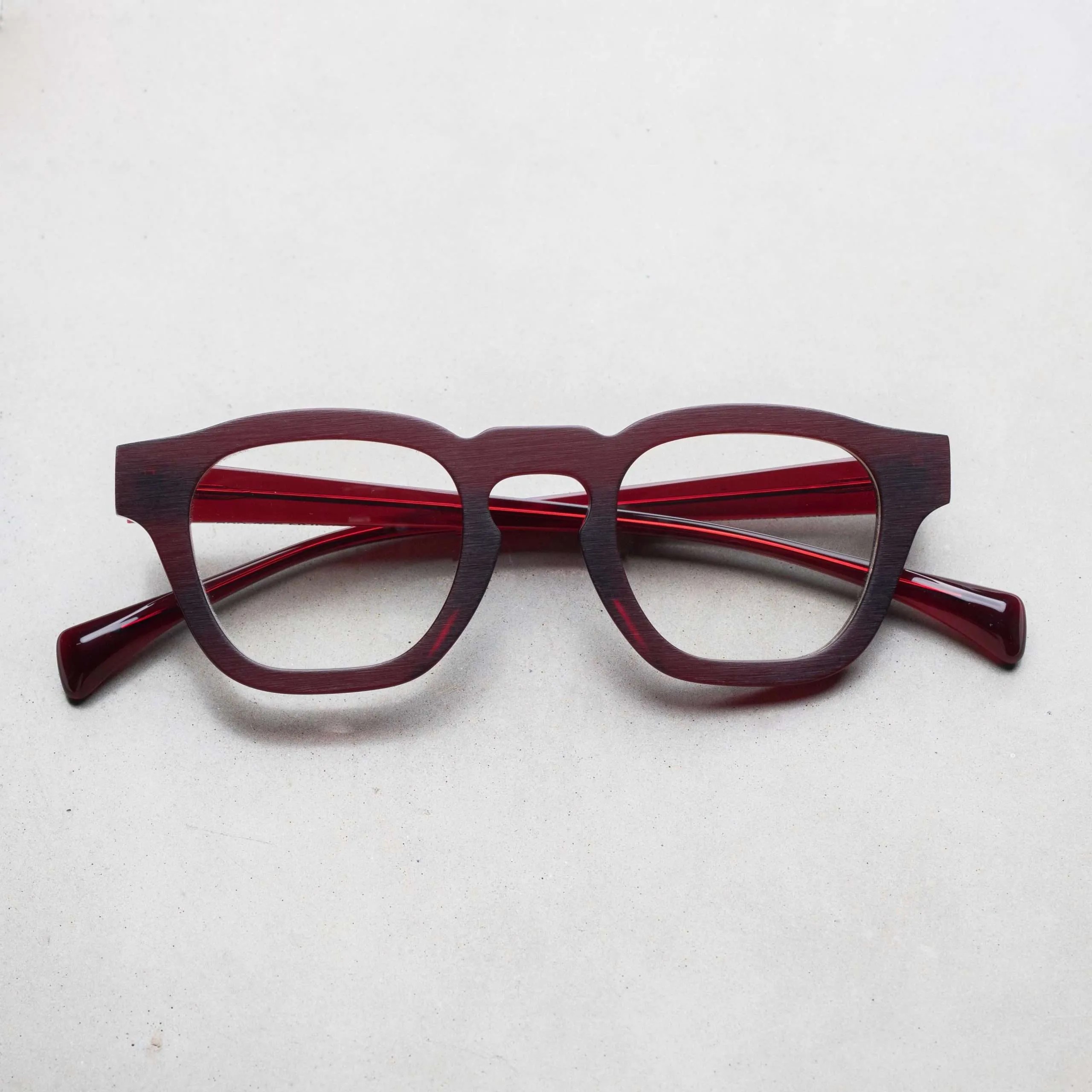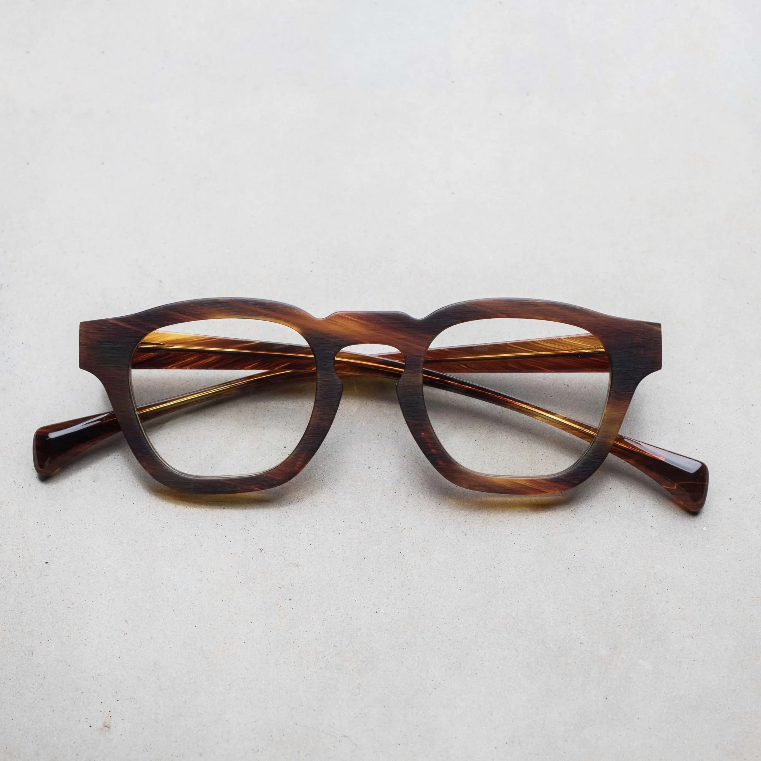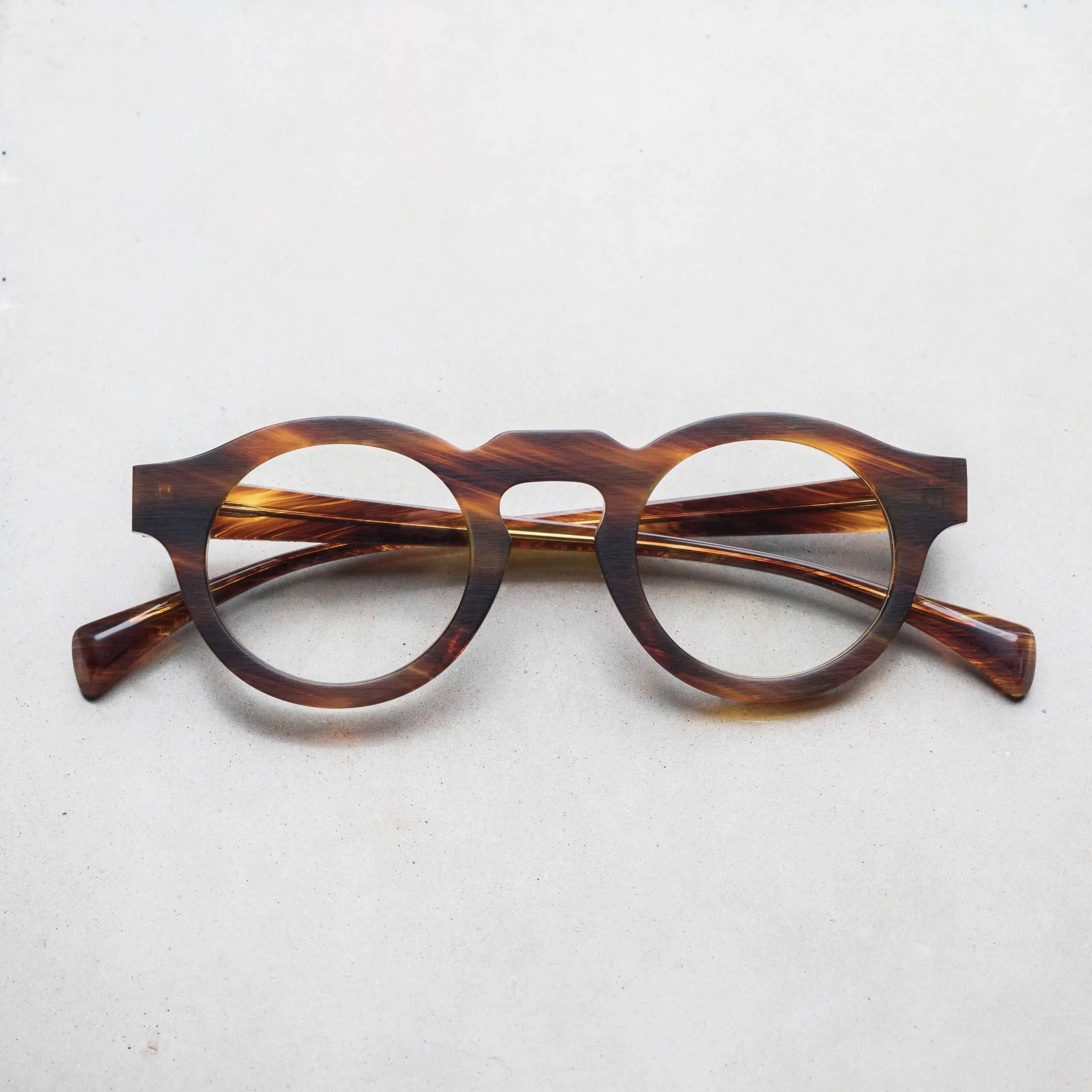 ブラッシングにより艶を消した表面加工やフラットなフロントデザイン、テンプル下の見えない部分にブランド名やモデル名を刻印するなど、ウィットに富んだセンスが随所から伺えます。