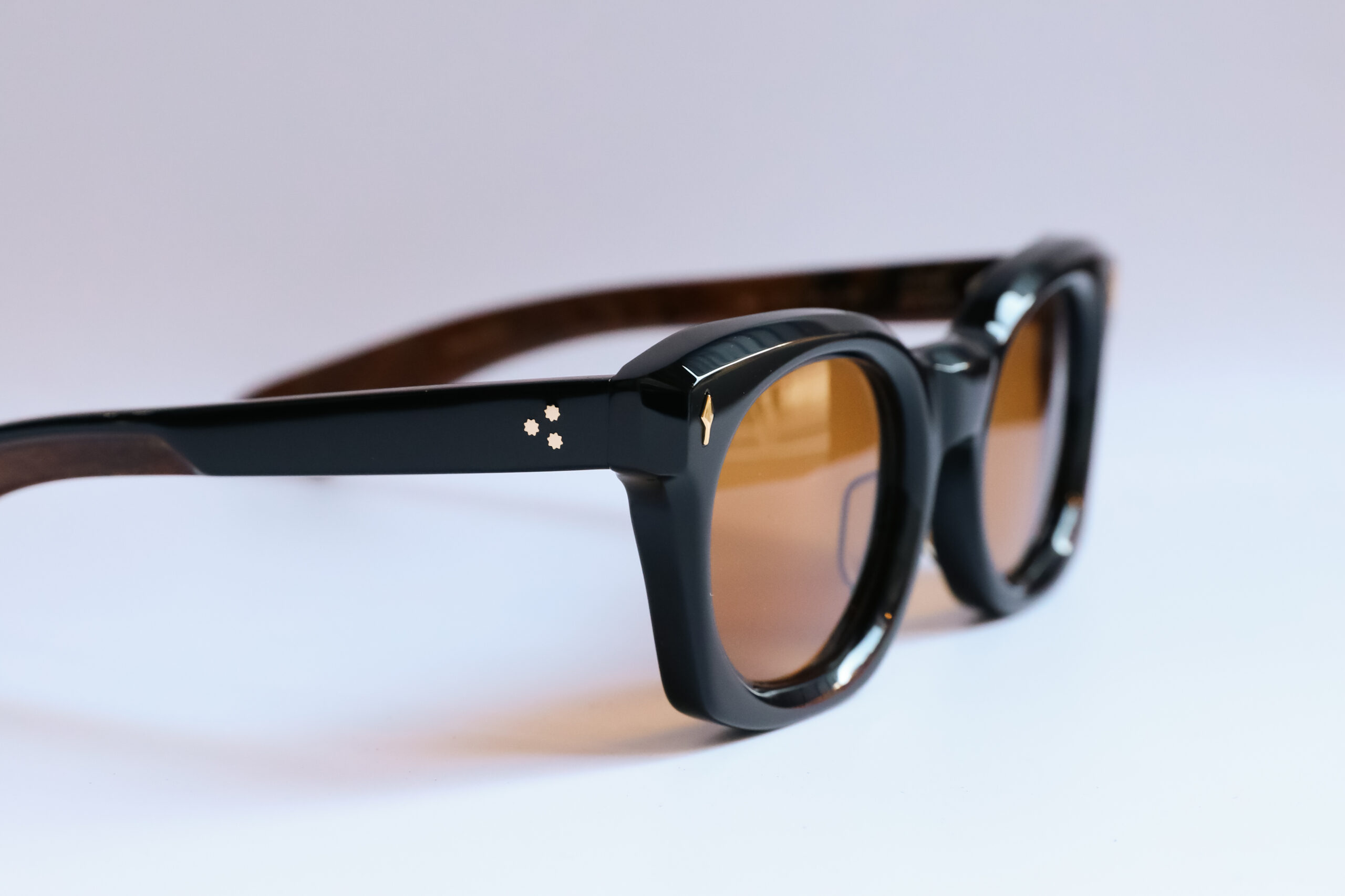 定番黒に、テンプル内側はブラウンベースの落ち着いたマーブル模様。レンズカラーには深みのあるオレンジを採用。