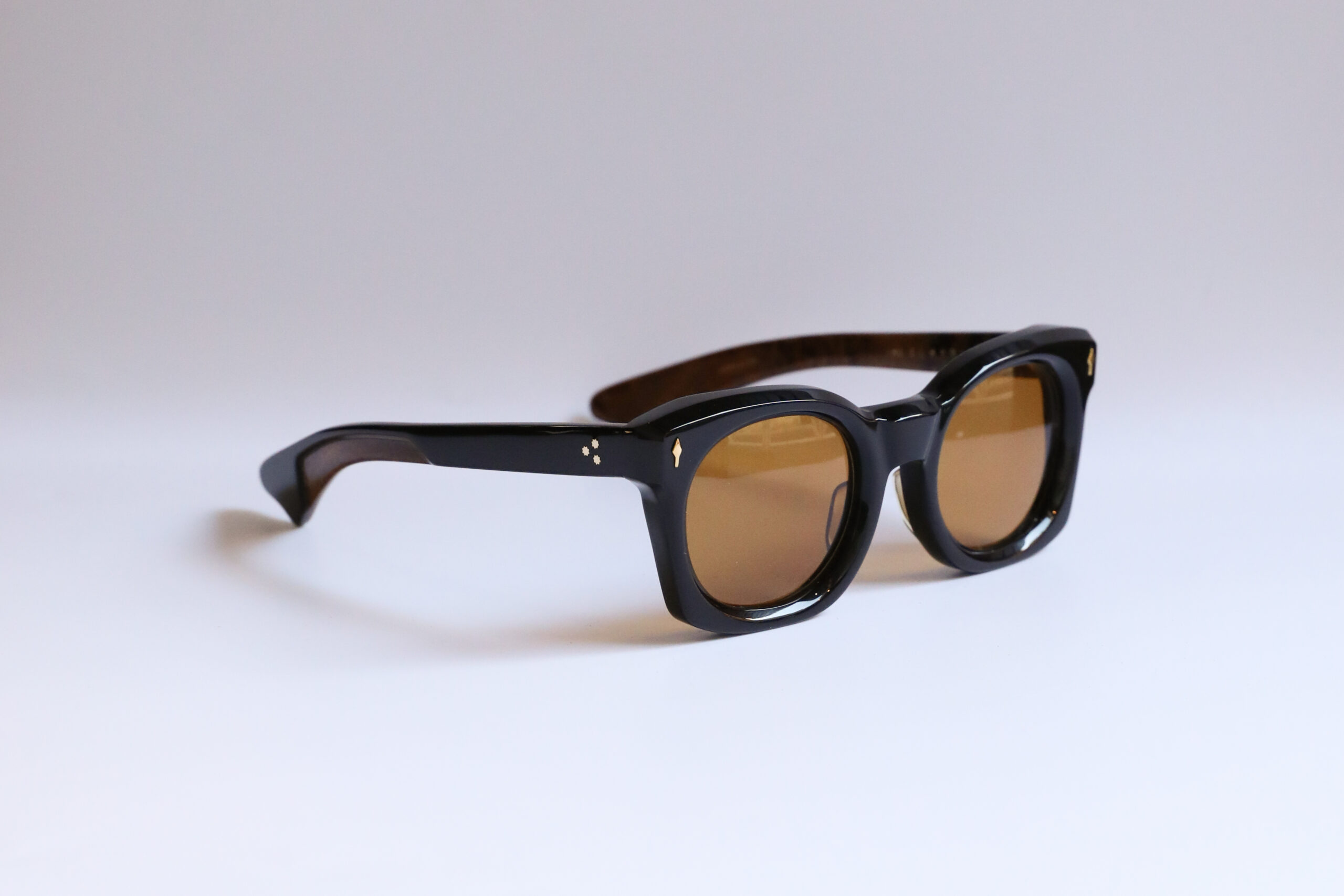 定番黒に、テンプル内側はブラウンベースの落ち着いたマーブル模様。レンズカラーには深みのあるオレンジを採用。