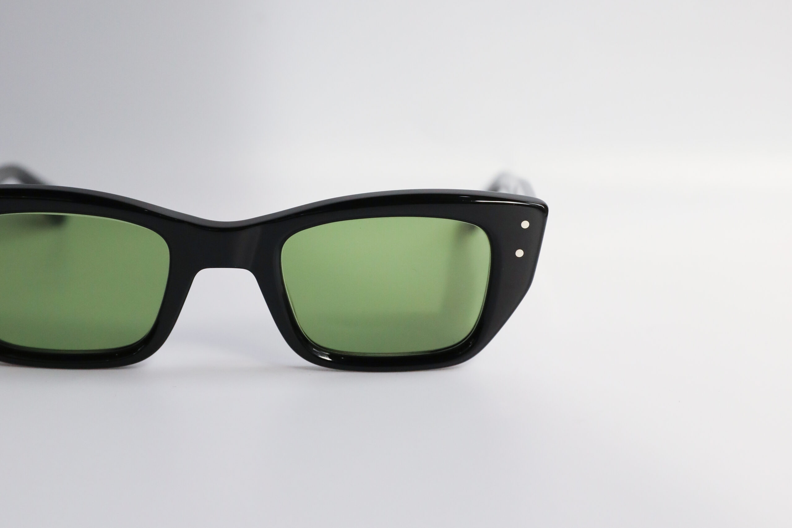 王道のブラックフレームに、深みのあるグリーンレンズ。