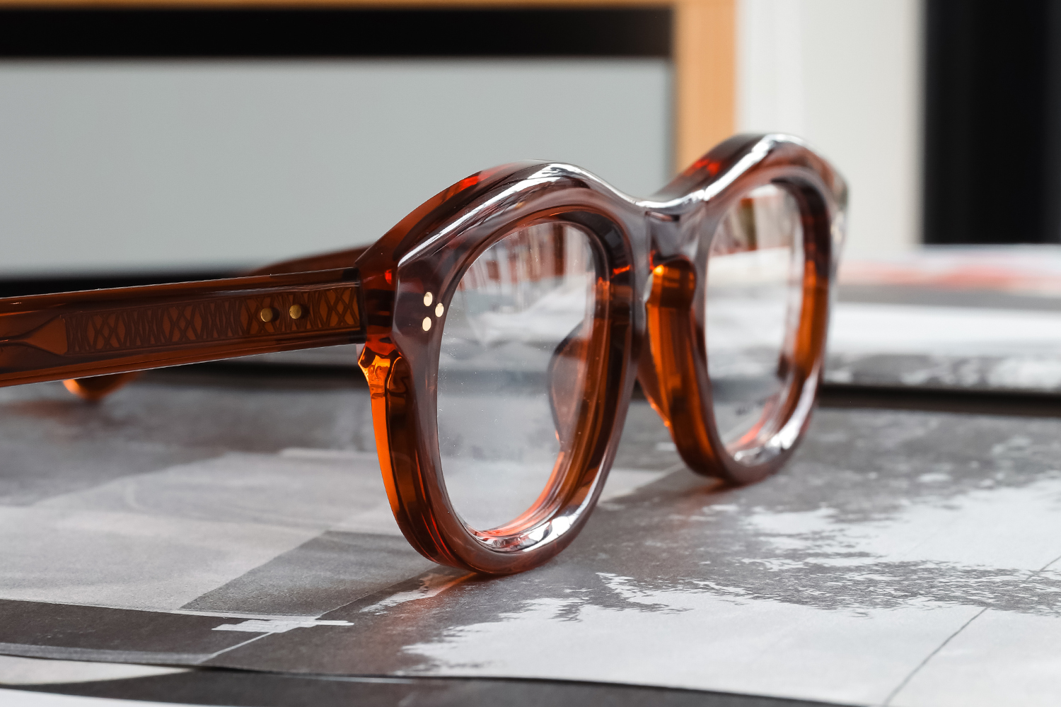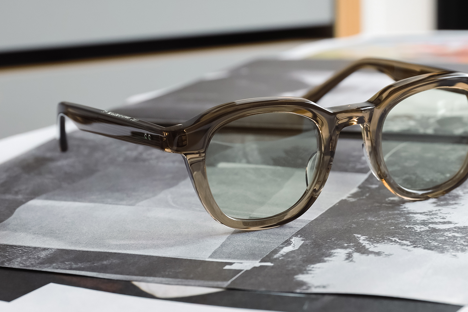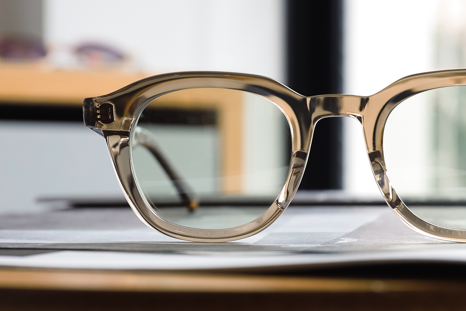 光を透かすと、黒縁には出せない柔らかさが生まれ、太めなのに野暮ったくないのは、BADAならではの削り出しがなせる業。