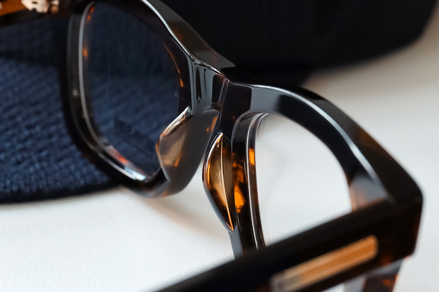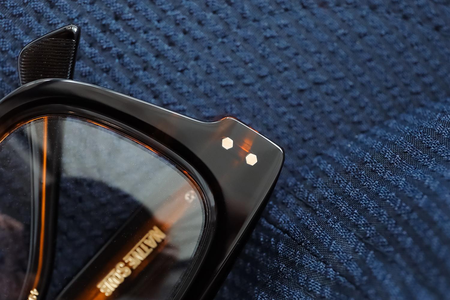 フロントに配された六角形のリベットは、単なる飾りではありません。テンプル内部の芯金ごとしっかり“かしめて”固定された構造で、外観のアクセントとしての役割と、機能的な堅牢性を兼ね備えています。