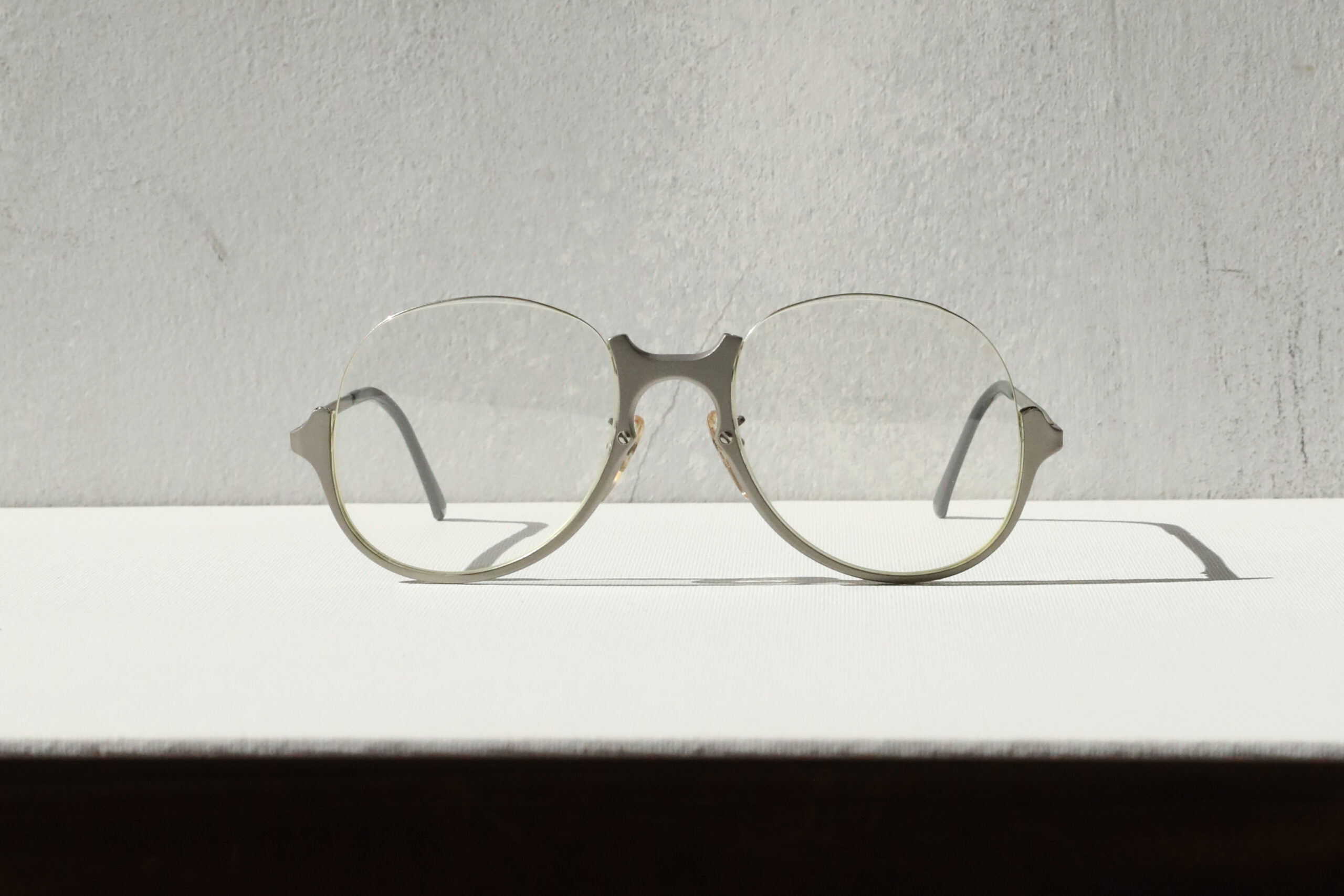 フロントは上半分を細いワイヤーで留めた、「アンダーリム」と言われる極めてミニマルな設計。